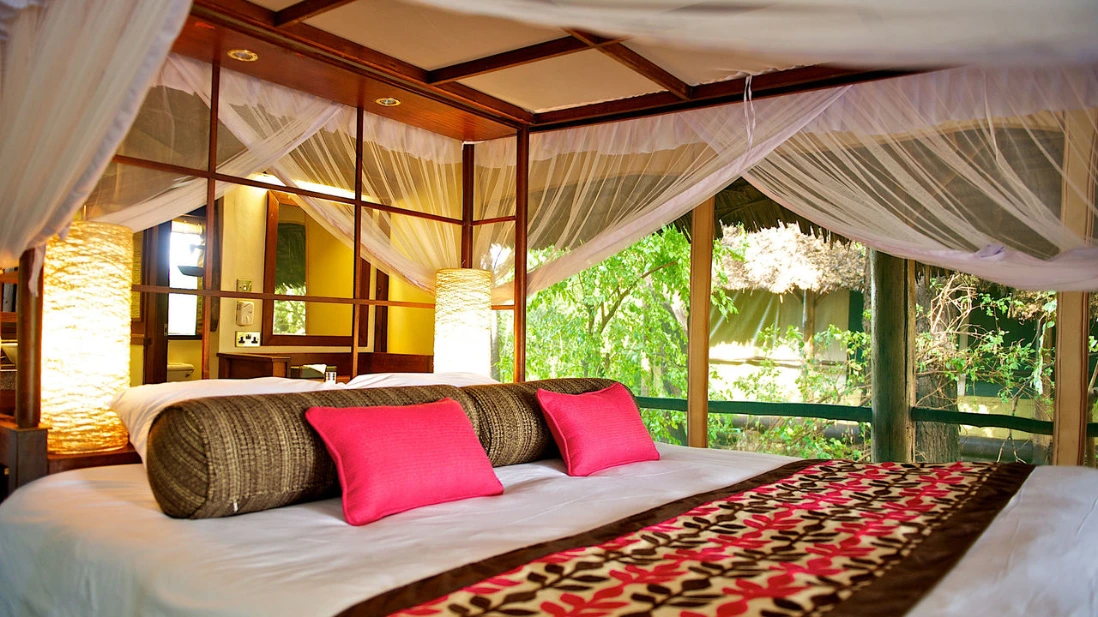 The camp accommodates guests in about 28 modern and newly refurbished tents, each raised on wooden decks with river views and furnished with comfortable safari-style décor, en-suite bathrooms, and outdoor verandas. The design capitalises on cooling breezes from the river and combines relaxed comfort with close contact with nature.