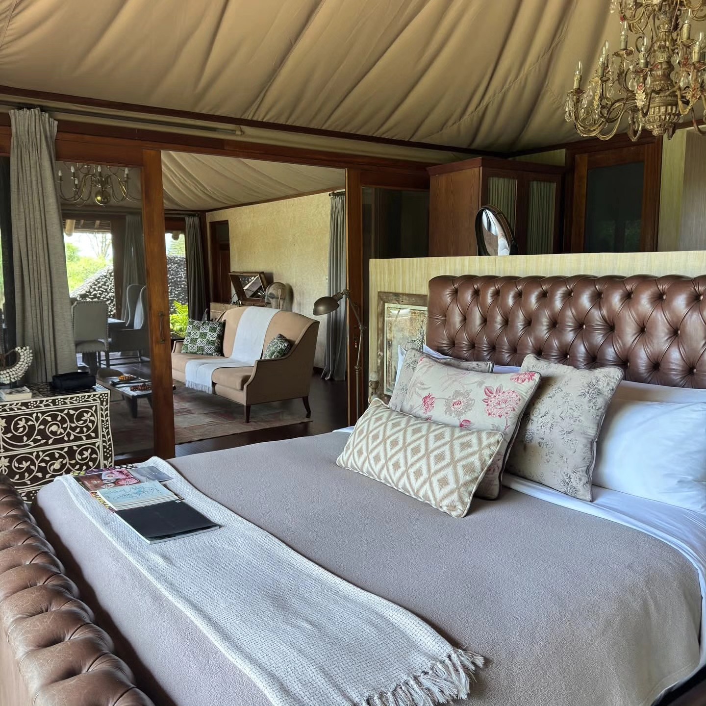 Dining is centered around an open, stylish restaurant serving gourmet cuisine inspired by fresh local ingredients. Guests can unwind at the chic bar lounge or enjoy sundowners by the infinity pool overlooking the springs. The camp also offers a luxury spa, yoga deck, gym, and wellness center, creating a balance between adventure and relaxation.